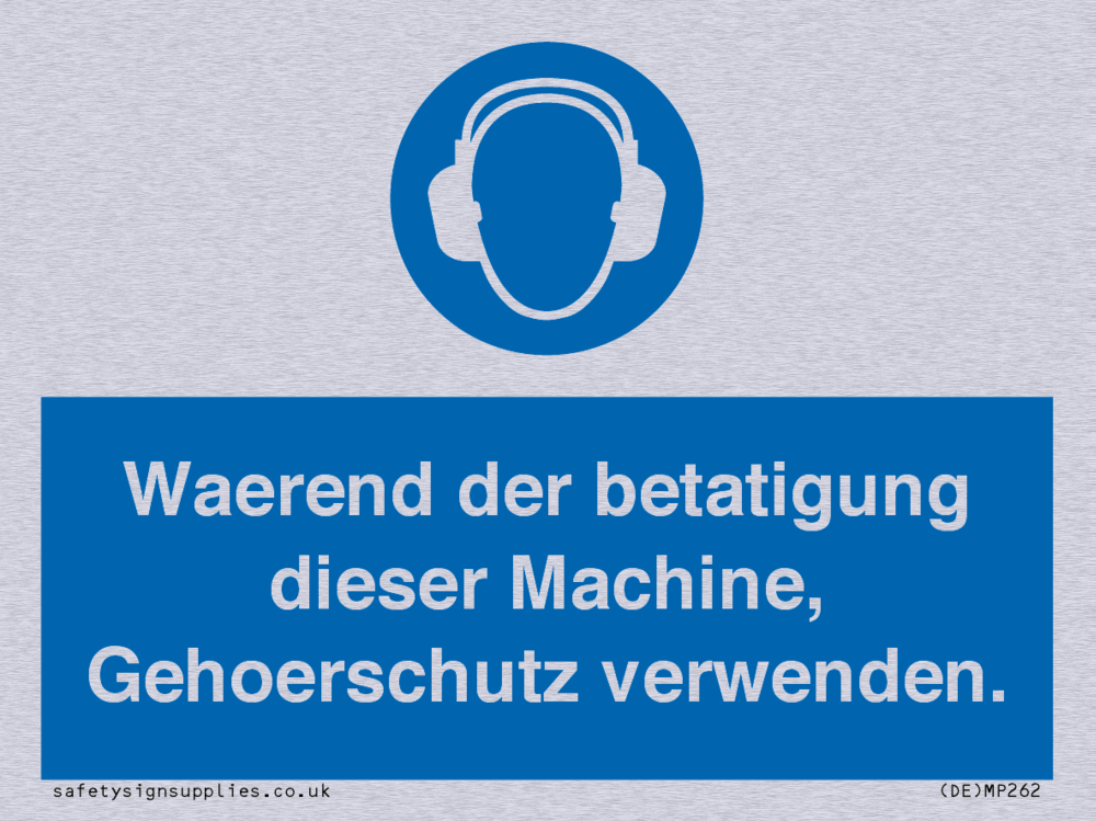 This sign contains an ear protection required symbol - person wearing ear defenders in white within blue circle.