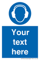 This sign contains an ear protection required symbol - person wearing ear defenders in white within blue circle.