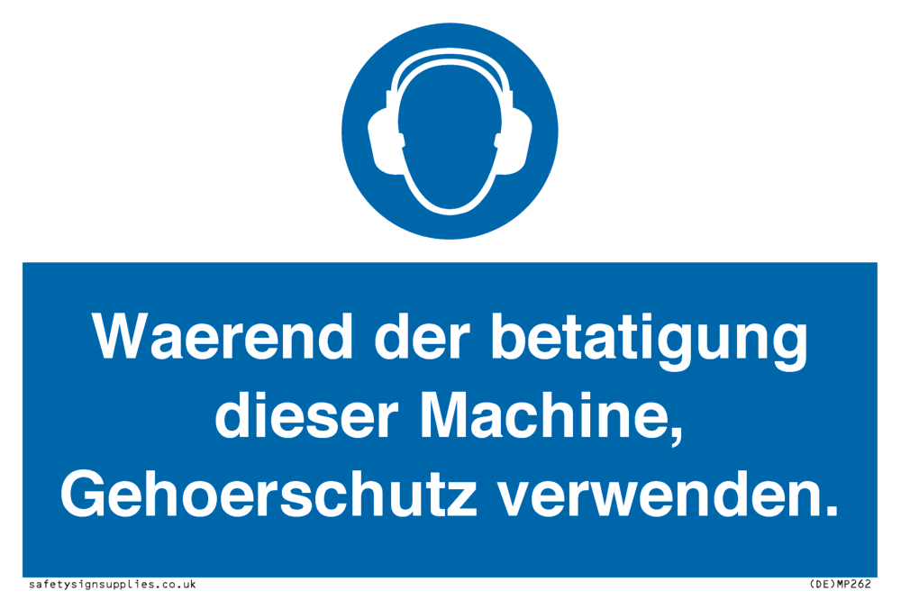 This sign contains an ear protection required symbol - person wearing ear defenders in white within blue circle.