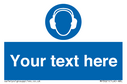 This sign contains an ear protection required symbol - person wearing ear defenders in white within blue circle.