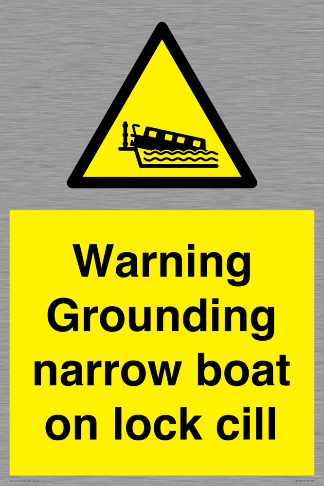 Sign Text: Warning Grounding narrow boat on lock cill