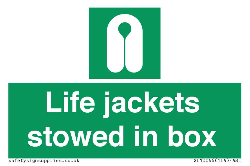 Sign Text: Life jackets stowed in box