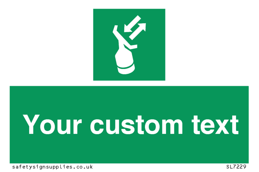 Suitable for mounting on a flat surface. Suitable for mounting on a door. Suitable for mounting on cladding. This product is design to be mounted on the ceiling. Custom signs contain the text required by the customer. With your your text and a standard safety sign symbol - a bespoke sign can fit any requirement.