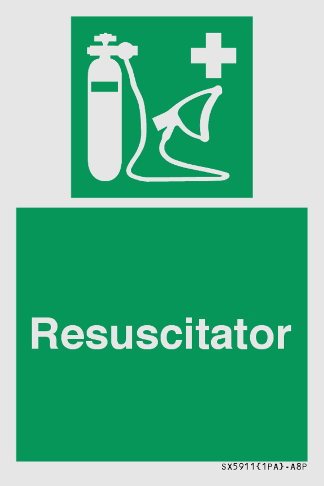 Sign Text: Resuscitator Dimensions: 50x75mm Material: White Reflective Aluminium Composite 3mm Orientation: Portrait Text Colour: White Background Colour: Green More...