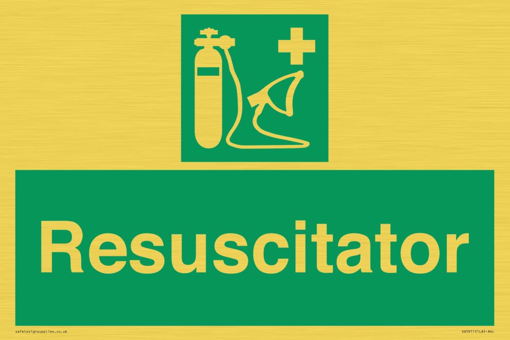 Sign Text: Resuscitator Dimensions: 300x200mm Material: Plastic Semi-rigid Gold Orientation: Landscape Text Colour: White Background Colour: Green More...