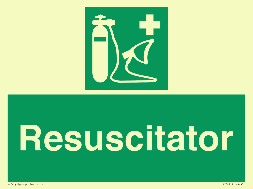 Sign Text: Resuscitator Dimensions: 200x150mm Material: Plastic Semi-rigid Photoluminescent Orientation: Landscape Text Colour: White Background Colour: Green More...