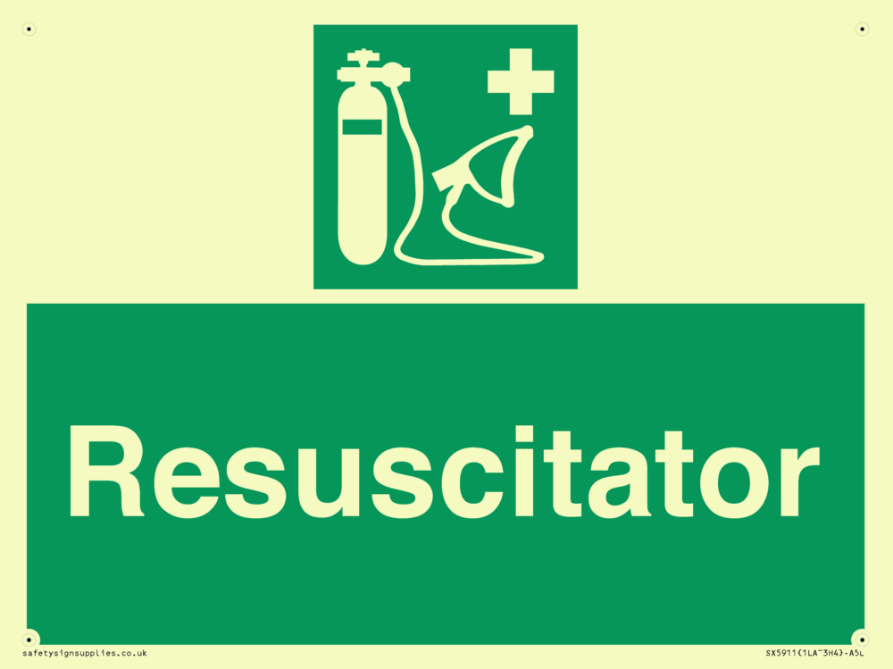 Sign Text: Resuscitator Dimensions: 200x150mm Material: Plastic Semi-rigid Photoluminescent Orientation: Landscape Text Colour: White Background Colour: Green More...
