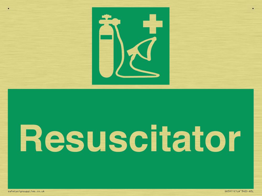 Sign Text: Resuscitator Dimensions: 200x150mm Material: Champagne Aluminium Orientation: Landscape Text Colour: White Background Colour: Green More...