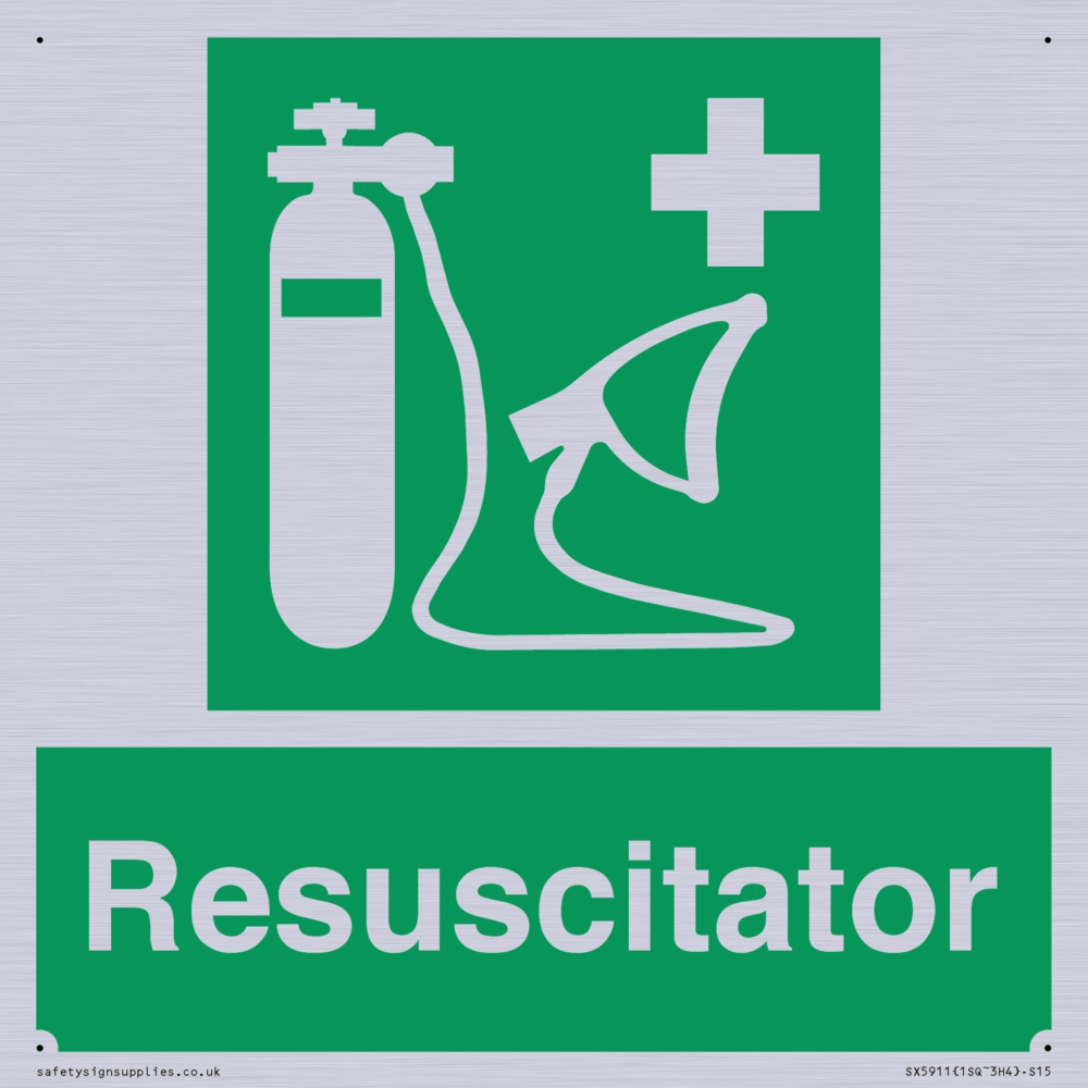 Sign Text: Resuscitator Dimensions: 150x150mm Material: Plastic Semi-rigid Silver Orientation: Square Text Colour: White Background Colour: Green More...