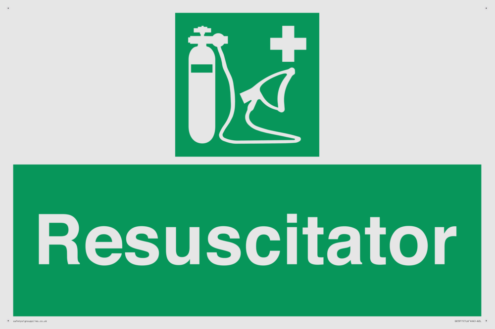 Sign Text: Resuscitator Dimensions: 600x400mm Material: White Reflective Aluminium Composite 3mm Orientation: Landscape Text Colour: White Background Colour: Green More...