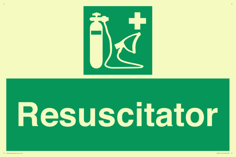 Sign Text: Resuscitator Dimensions: 600x400mm Material: Plastic Semi-rigid Photoluminescent Orientation: Landscape Text Colour: White Background Colour: Green More...