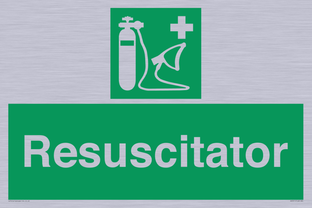 Sign Text: Resuscitator Dimensions: 600x400mm Material: Aluminium composite 3mm brushed silver Orientation: Landscape Text Colour: White Background Colour: Green More...