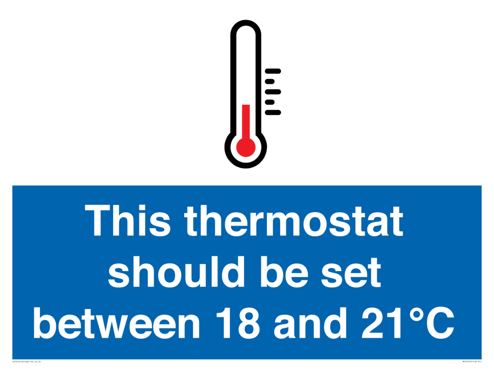 This thermostat should be set between 18 and 21°C Sign
