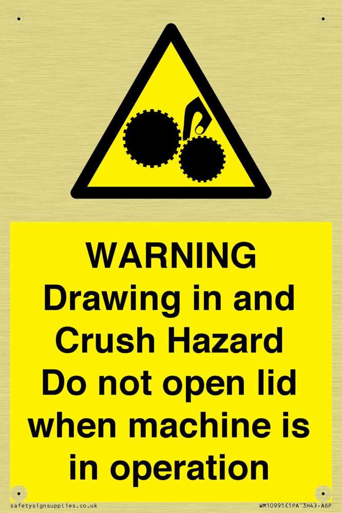 WARNING Drawing in and Crush Hazard Do not open lid when machine is in operation