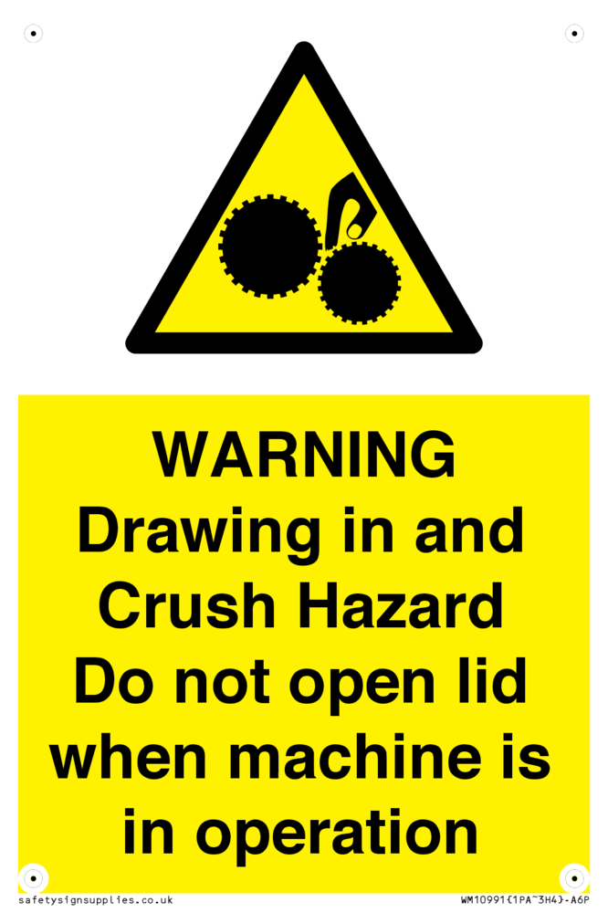 WARNING Drawing in and Crush Hazard Do not open lid when machine is in operation