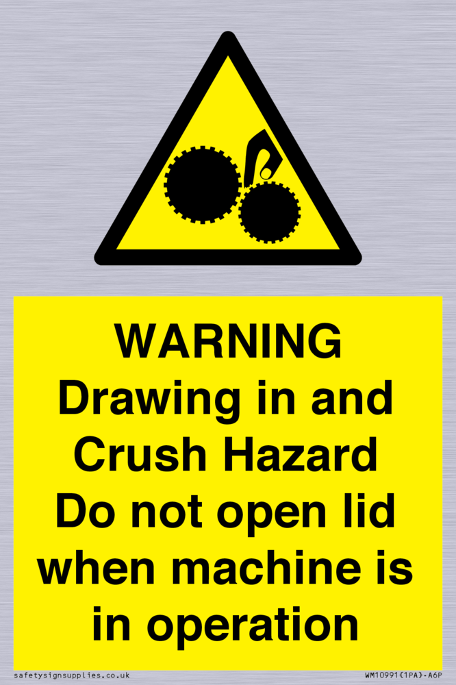 WARNING Drawing in and Crush Hazard Do not open lid when machine is in operation