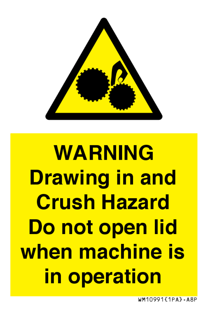 WARNING Drawing in and Crush Hazard Do not open lid when machine is in operation