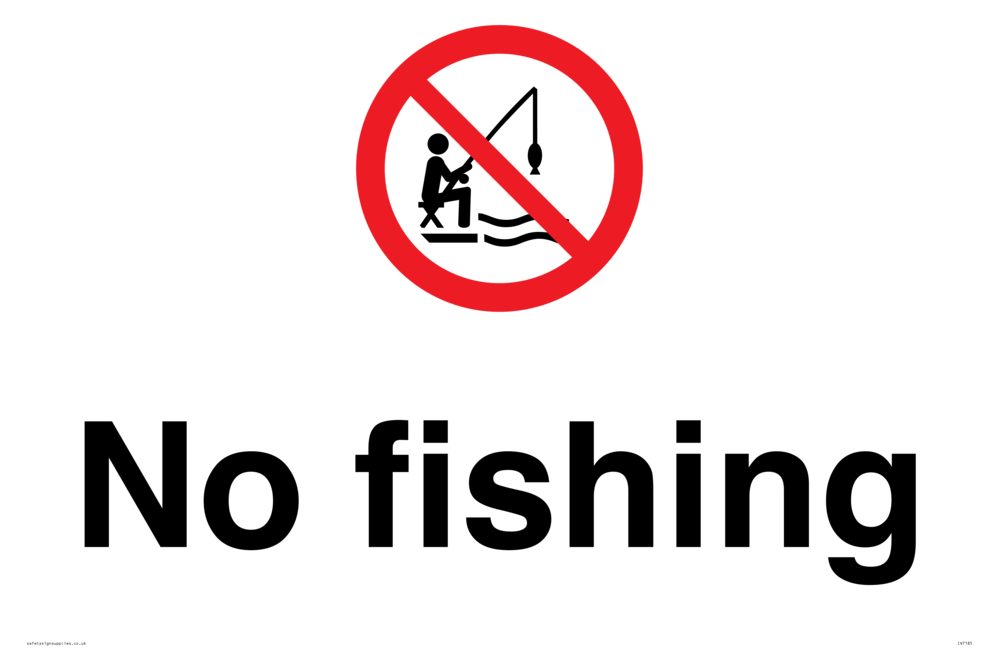 This sign contains a no fishing symbol of a person with rod and line catching a fish with red prohibited circle crossed through with a diagonal line.