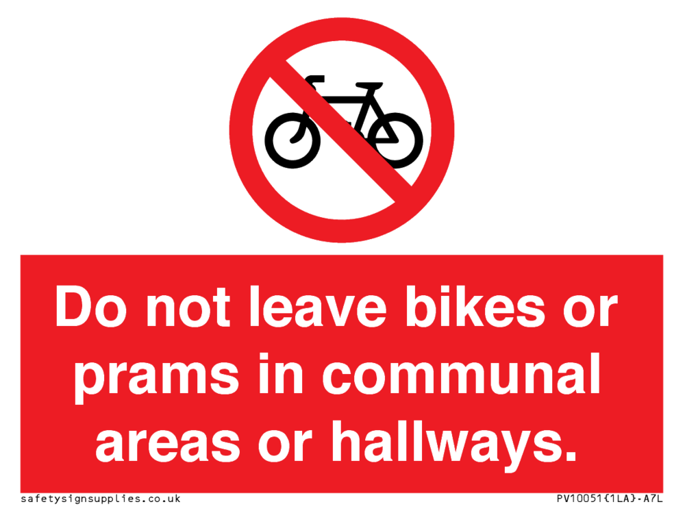 Do not leave bikes or prams in communal areas or hallways. Sign