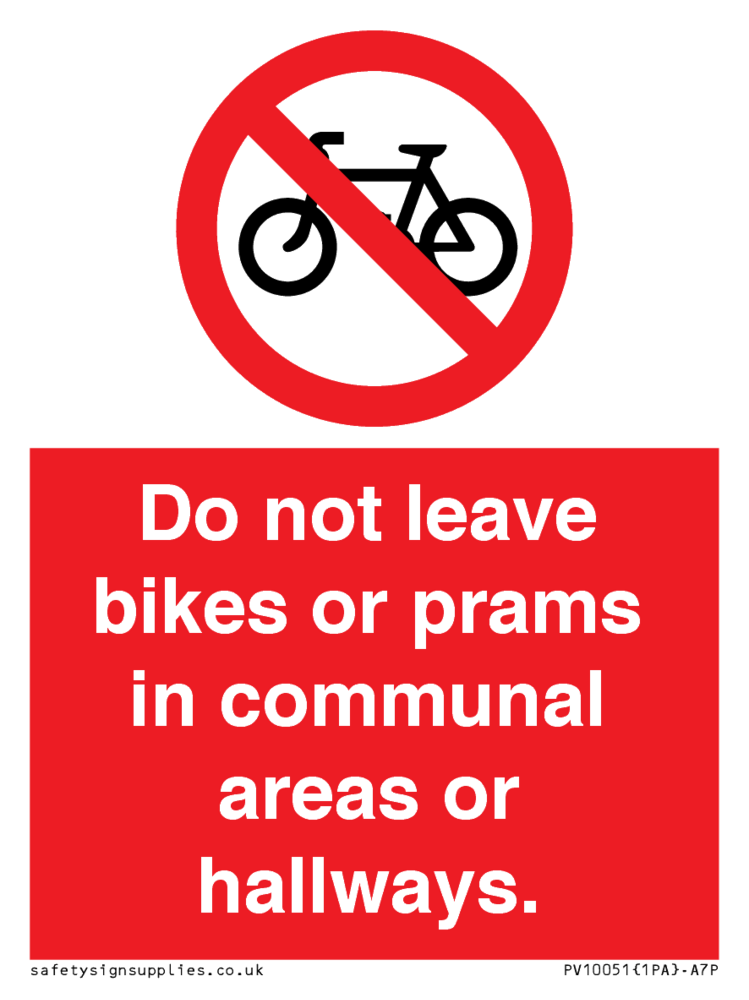Do not leave bikes or prams in communal areas or hallways. Sign