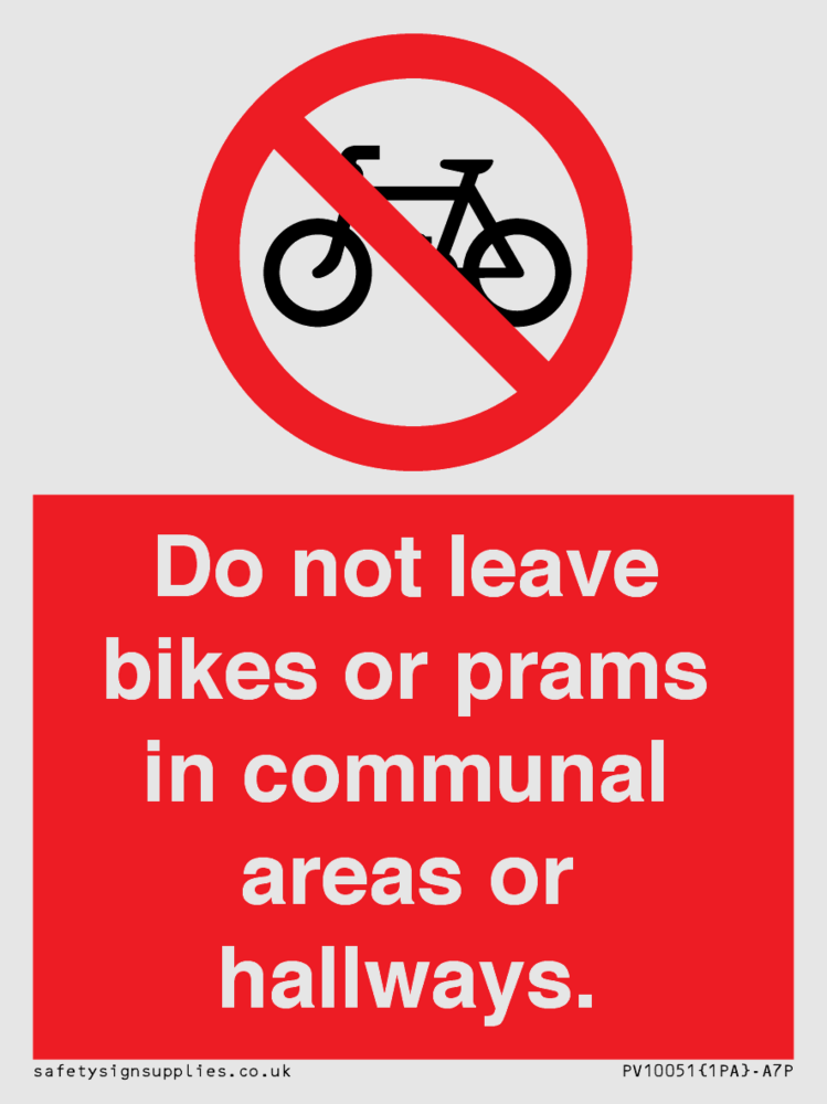 Do not leave bikes or prams in communal areas or hallways. Sign