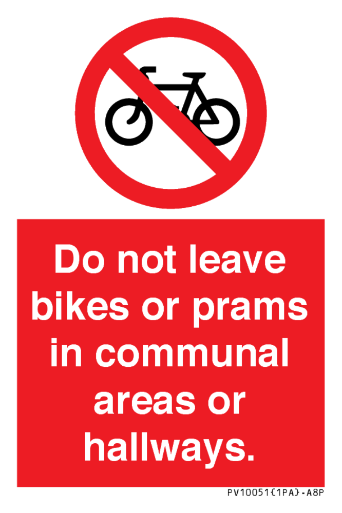 Do not leave bikes or prams in communal areas or hallways. Sign