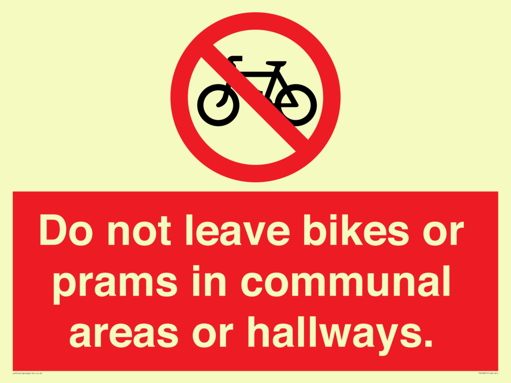 Do not leave bikes or prams in communal areas or hallways. Sign