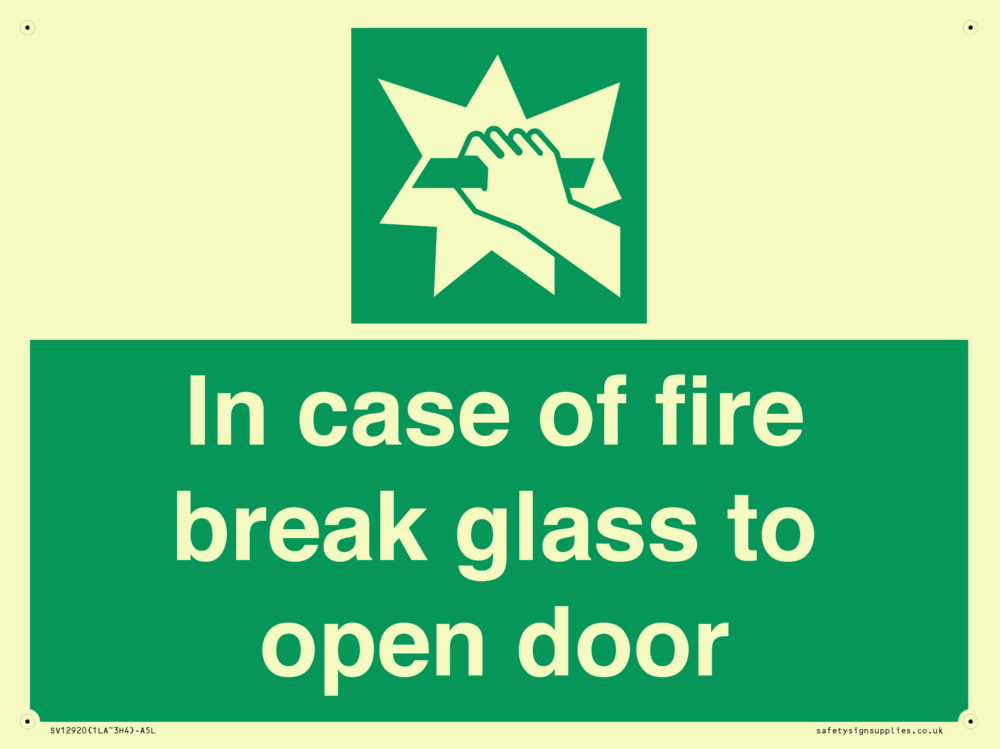In case of fire break glass to open door Sign