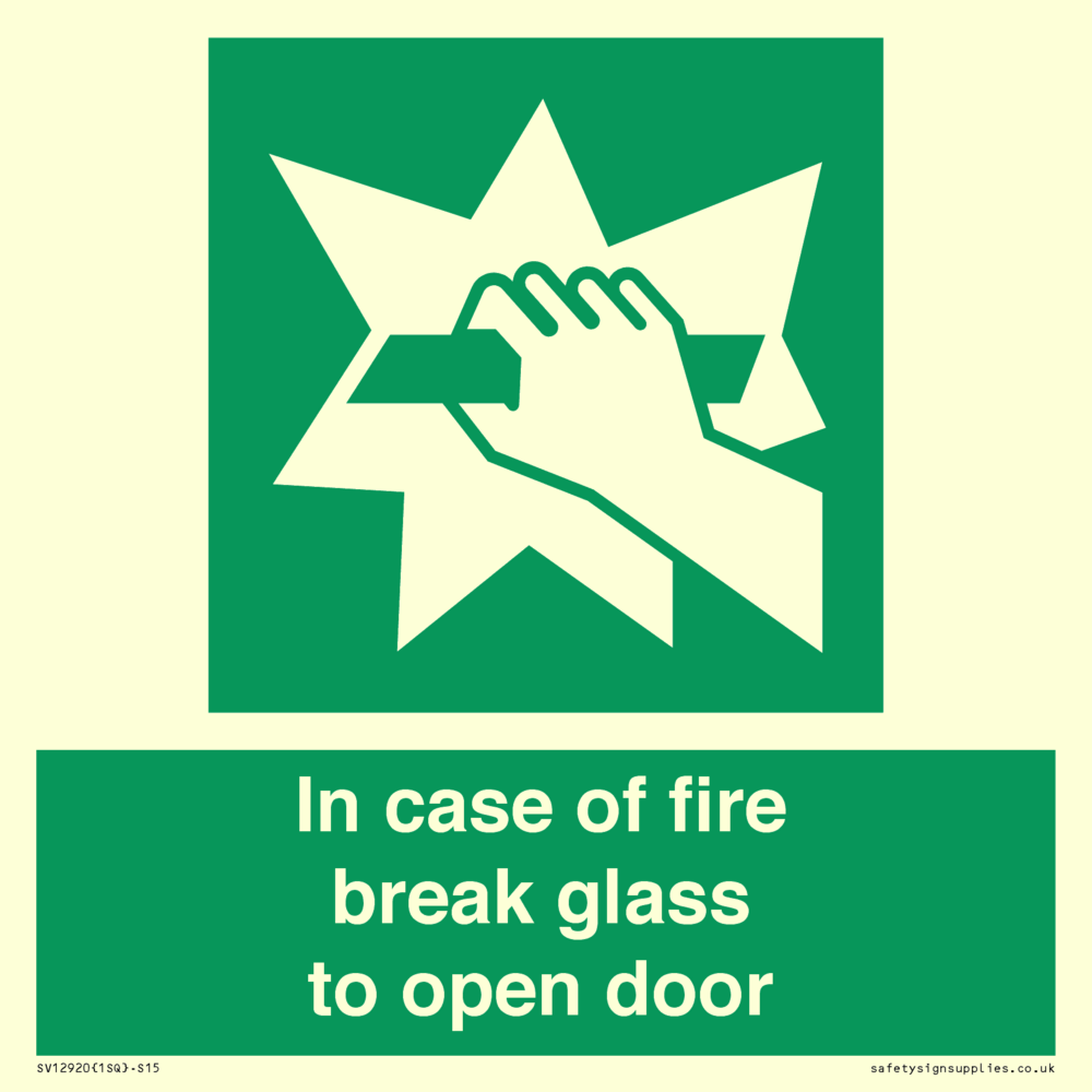 In case of fire break glass to open door Sign