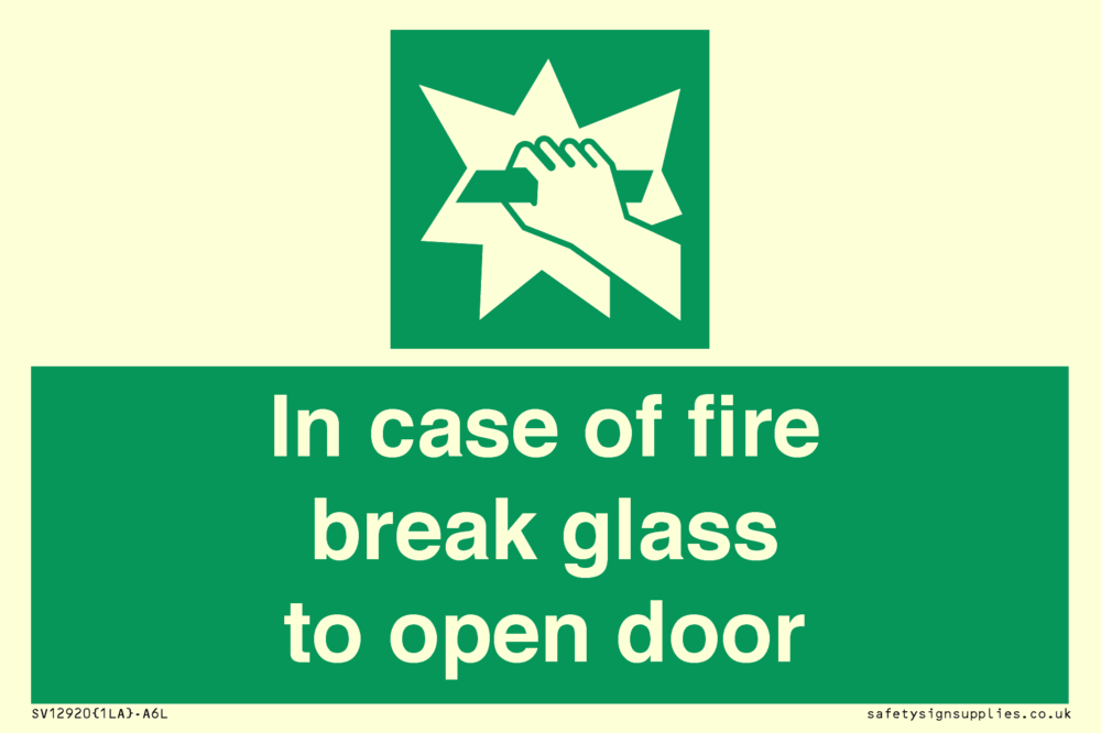 In case of fire break glass to open door Sign