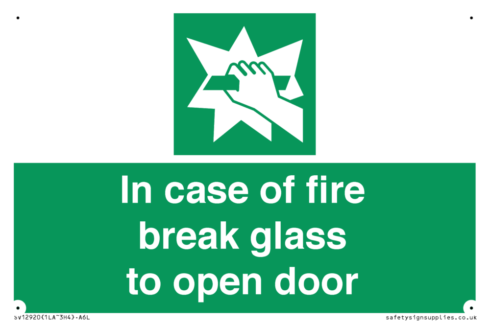 In case of fire break glass to open door Sign