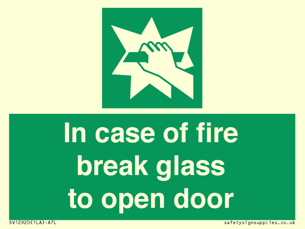 In case of fire break glass to open door Sign