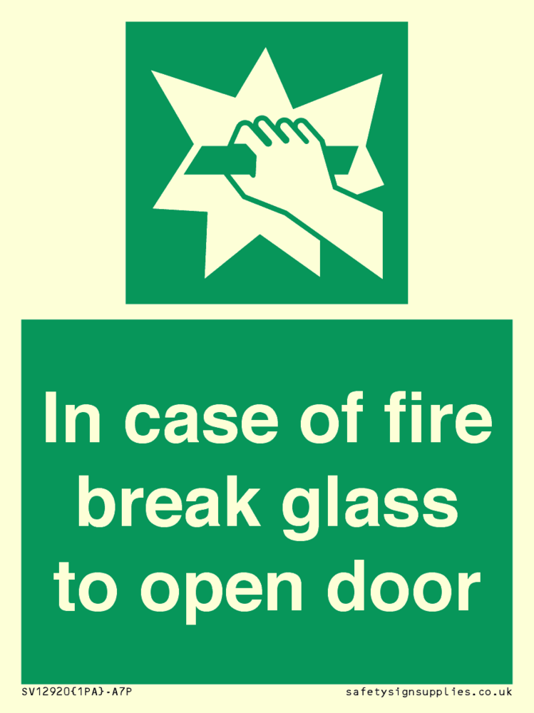 In case of fire break glass to open door Sign