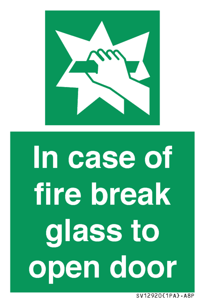In case of fire break glass to open door Sign