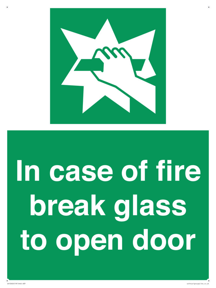 In case of fire break glass to open door Sign