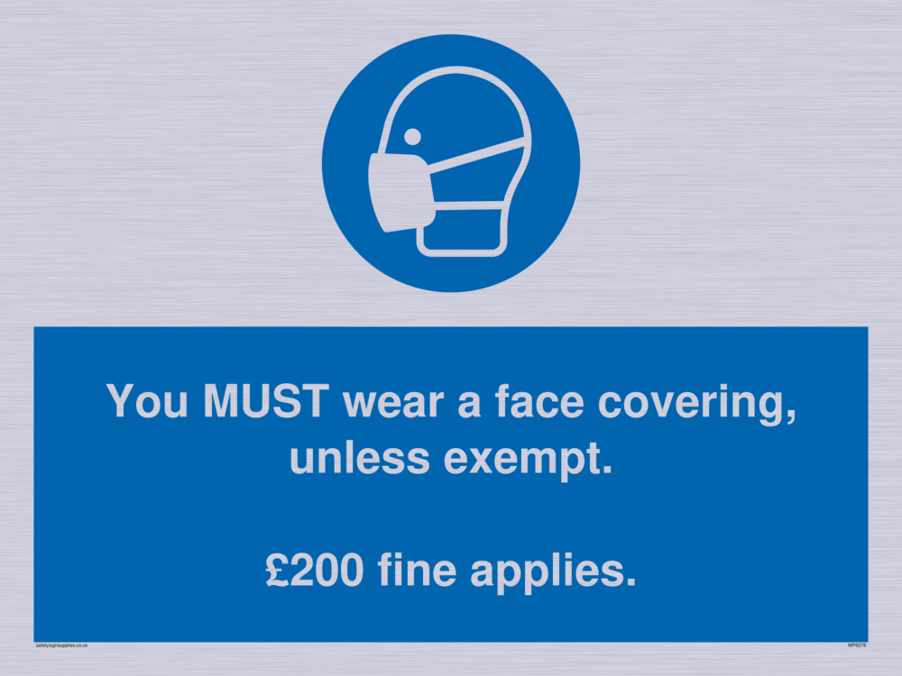 You MUST wear a face covering, unless exempt. £200 fine applies. Sign