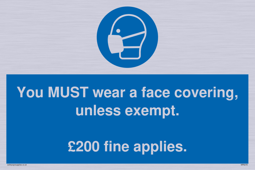 You MUST wear a face covering, unless exempt. £200 fine applies. Sign