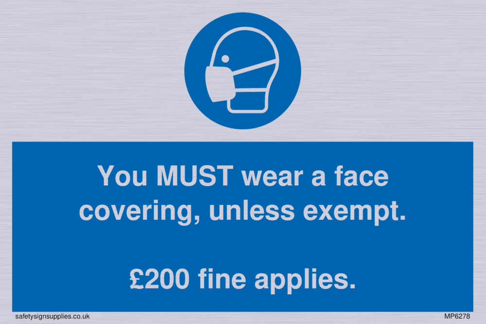 You MUST wear a face covering, unless exempt. £200 fine applies. Sign