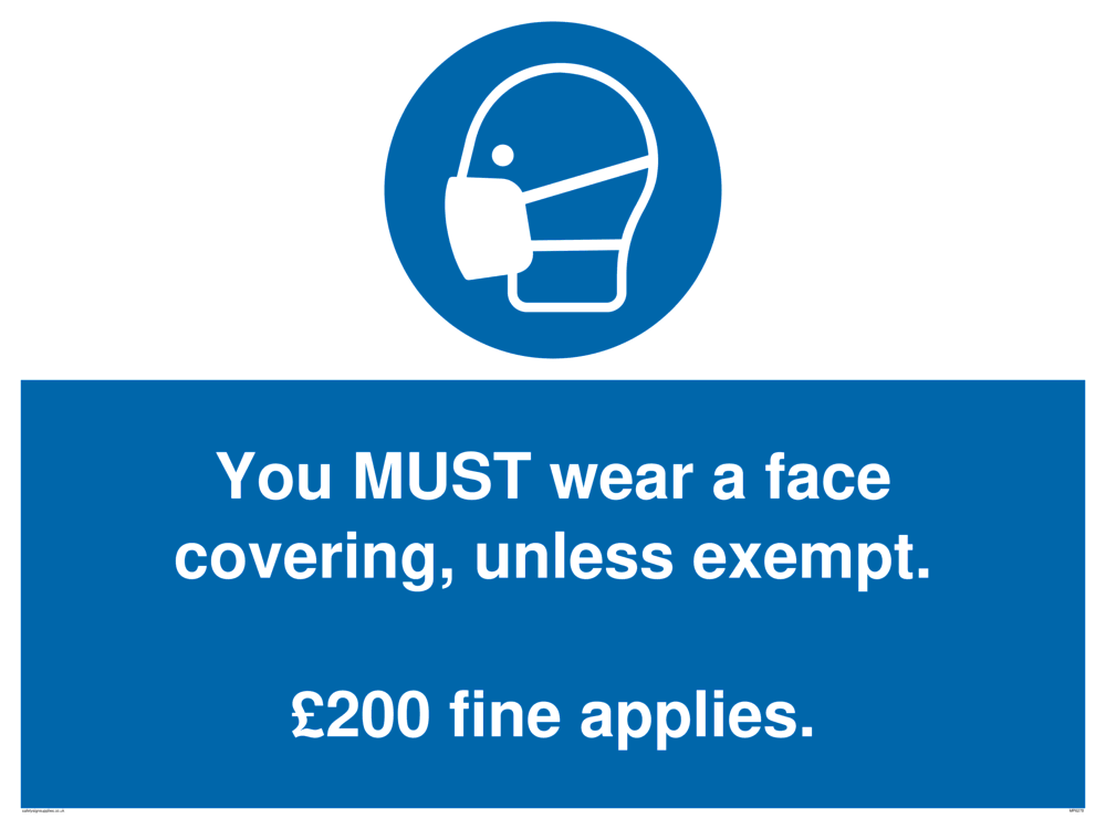 You MUST wear a face covering, unless exempt. £200 fine applies. Sign