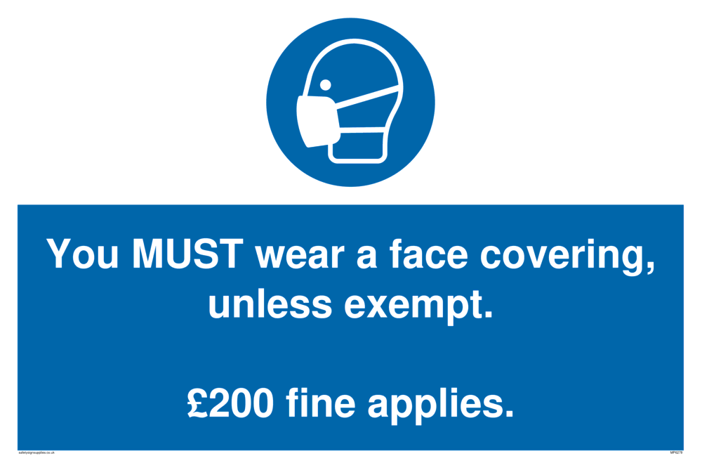 You MUST wear a face covering, unless exempt. £200 fine applies. Sign