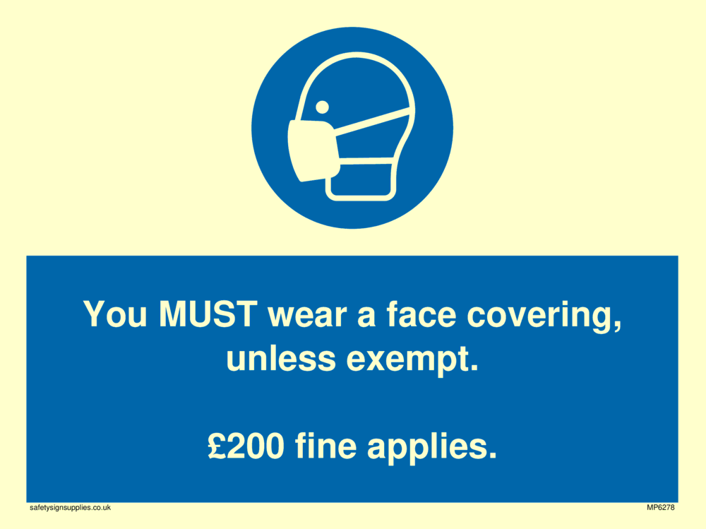 You MUST wear a face covering, unless exempt. £200 fine applies. Sign