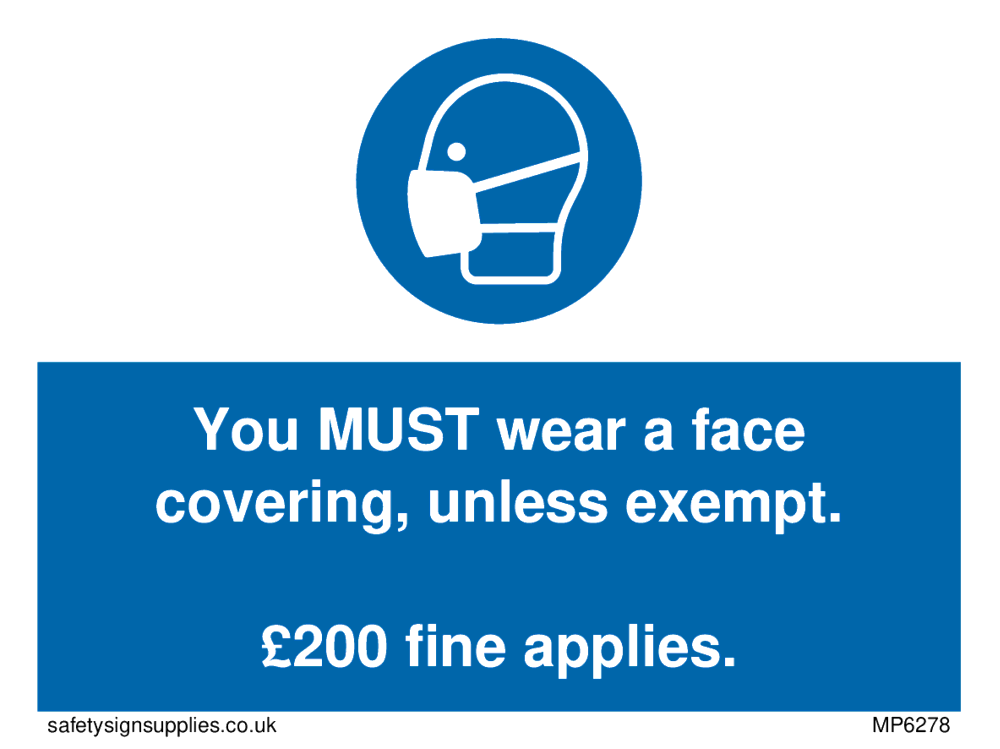 You MUST wear a face covering, unless exempt. £200 fine applies. Sign