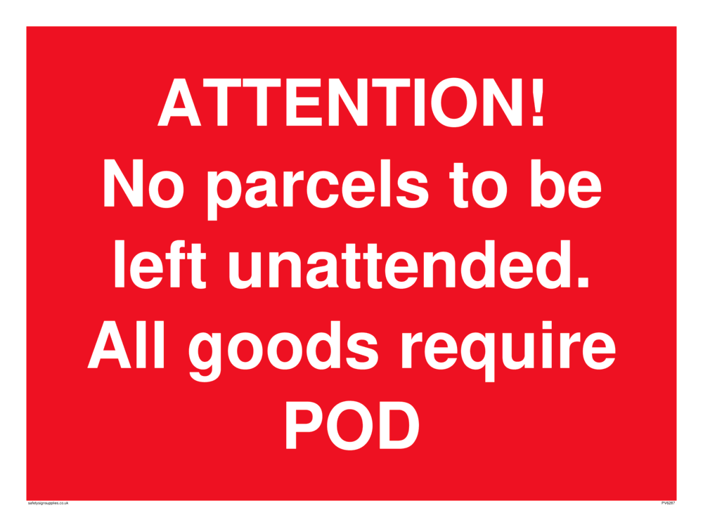 ATTENTION! No parcels to be left unattended All goods require POD Sign