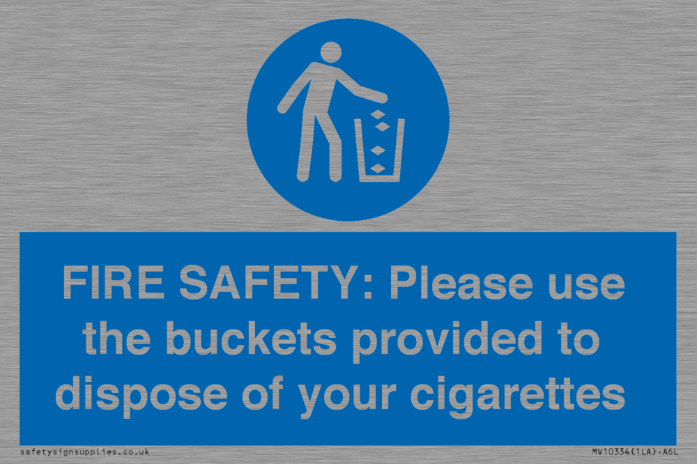 FIRE SAFETY: Please use the buckets provided to dispose of your cigarettes Sign