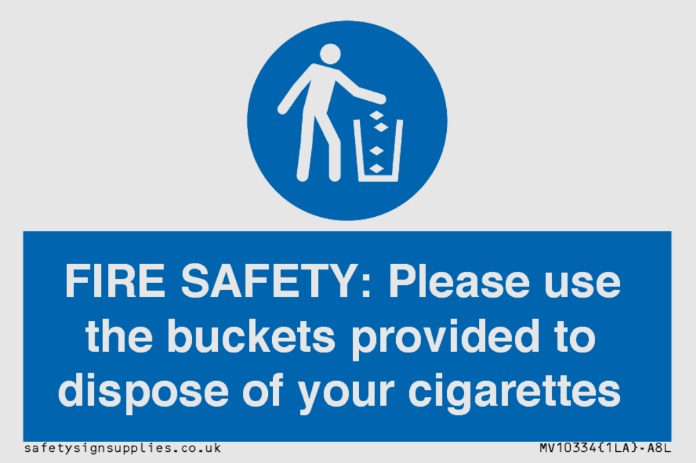 FIRE SAFETY: Please use the buckets provided to dispose of your cigarettes Sign