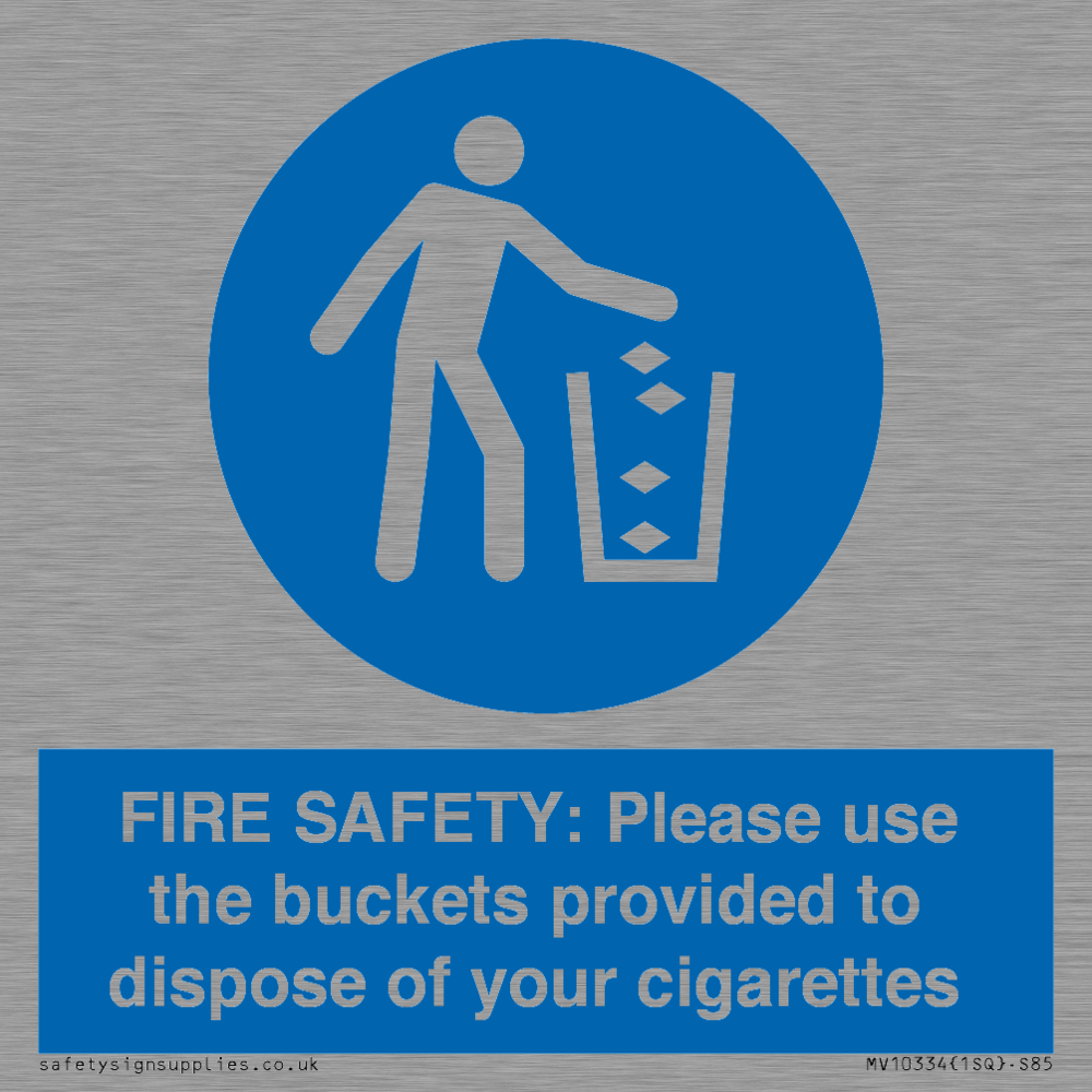 FIRE SAFETY: Please use the buckets provided to dispose of your cigarettes Sign