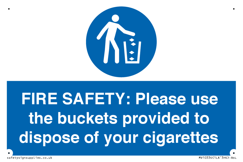 FIRE SAFETY: Please use the buckets provided to dispose of your cigarettes Sign