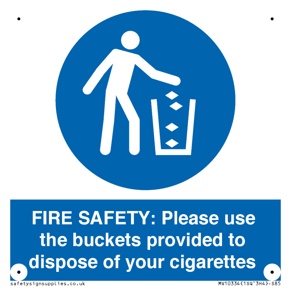 FIRE SAFETY: Please use the buckets provided to dispose of your cigarettes Sign