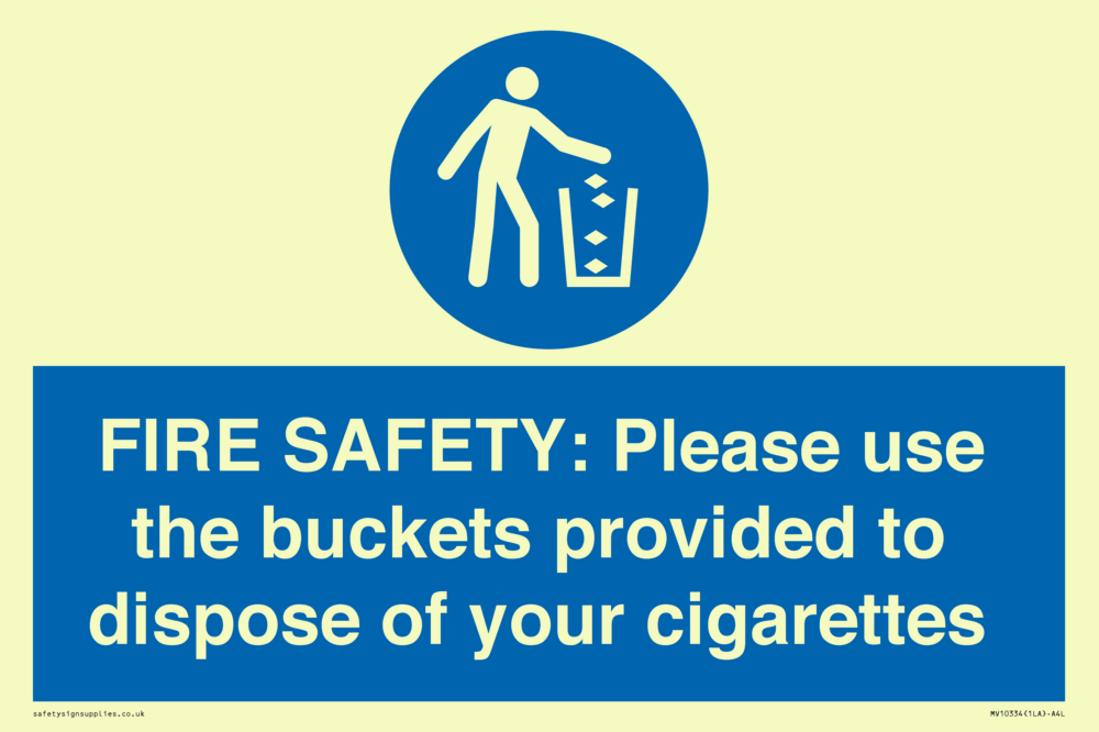 FIRE SAFETY: Please use the buckets provided to dispose of your cigarettes Sign