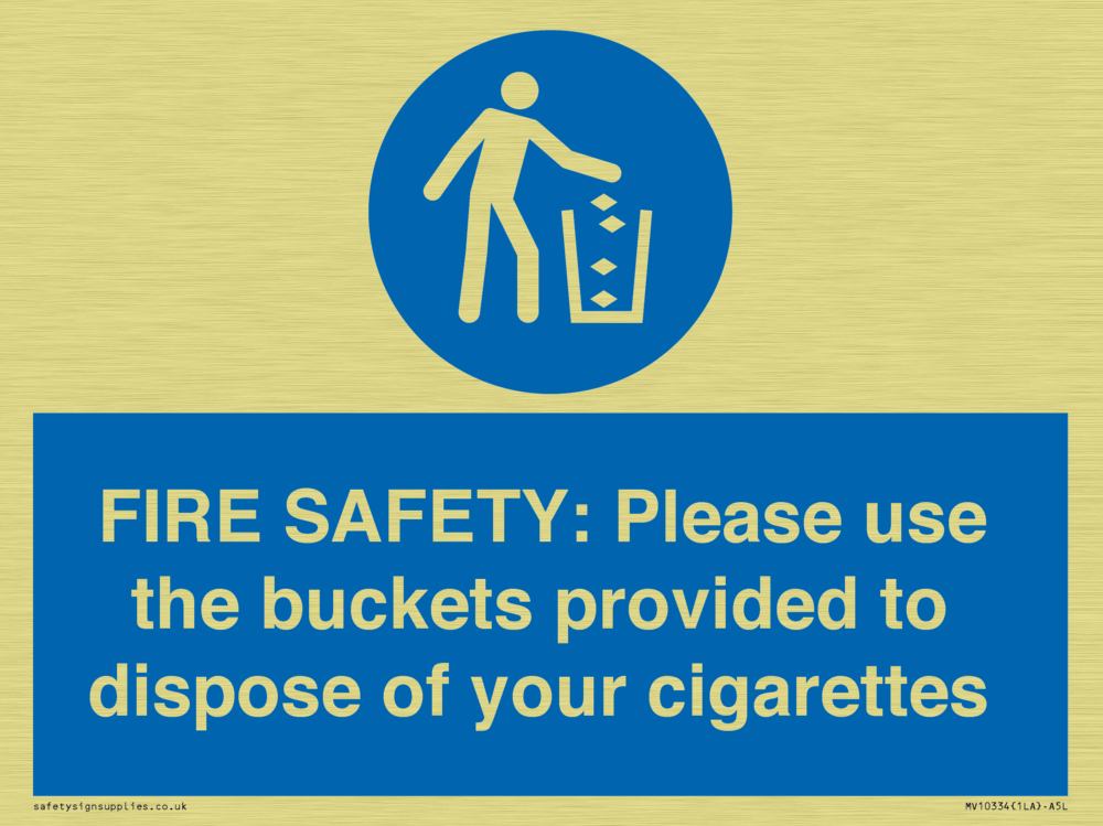 FIRE SAFETY: Please use the buckets provided to dispose of your cigarettes Sign